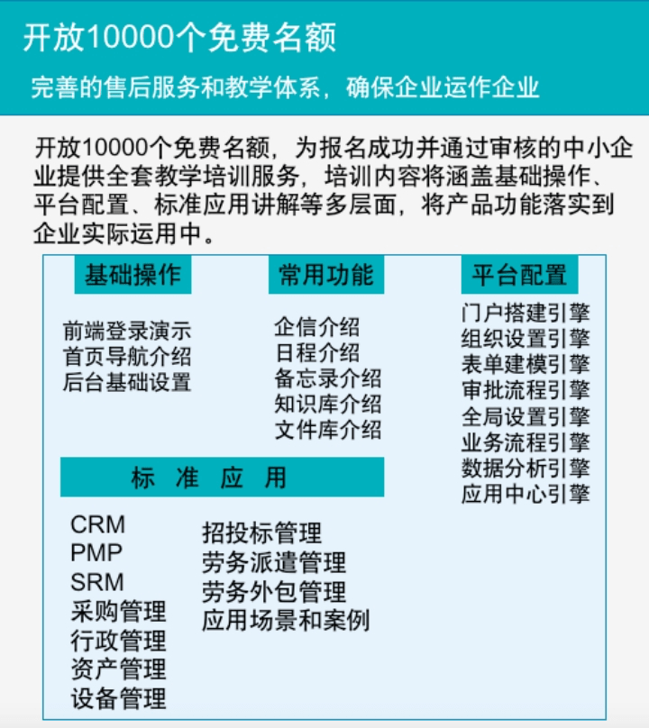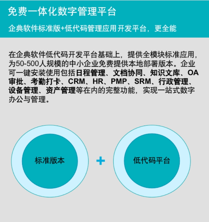 成功加入“助企计划”,企业不仅可以获得一整套功能覆盖日程管理、知识管理、考勤打卡、文档协同、OA审批、CRM、HR、SRM、PMP、行政管理、资产管理、设备管理的一体化管理平台,另外还可以运用低代码开发平台进行无限个性化应用搭建,0基础也能在30分钟完成一个企业应用搭建,让企业真正实现管理软件自由!