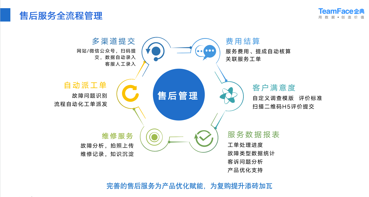 结合案例,已经有大量的企业在使用企典软件售后服务功能,打通微信公众号,让用户可以自主报修,通过服务工单的集中处理,我们可以自动派单、人工派单,还可以连接外部的企业伙伴,服务工程师,服务商,最终在整个服务过程中,我们涉及到备件的领用,去现场服务,最终通过问卷采集的方式获取客户对服务的评价。最终,通过我们的数据可以来观测服务的整个流程,以及提升我们服务的这种效率的一些分析,这是我们核心在解决的问题。